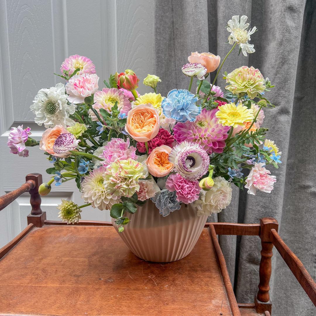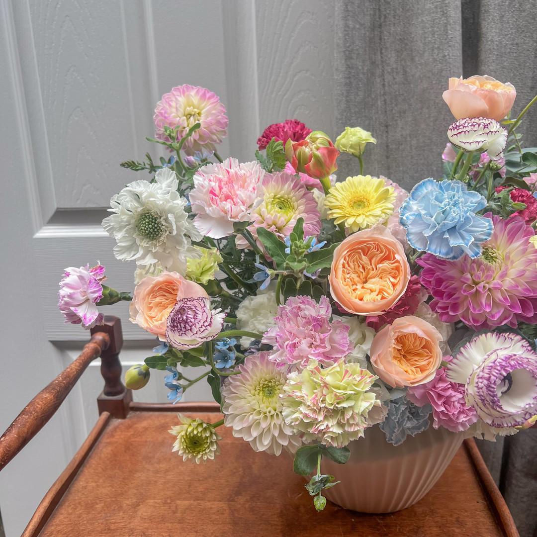 花材:康乃馨、太陽花、陸連、庭園玫瑰、大理花、藍星花、桔梗、鬱金香、松蟲草