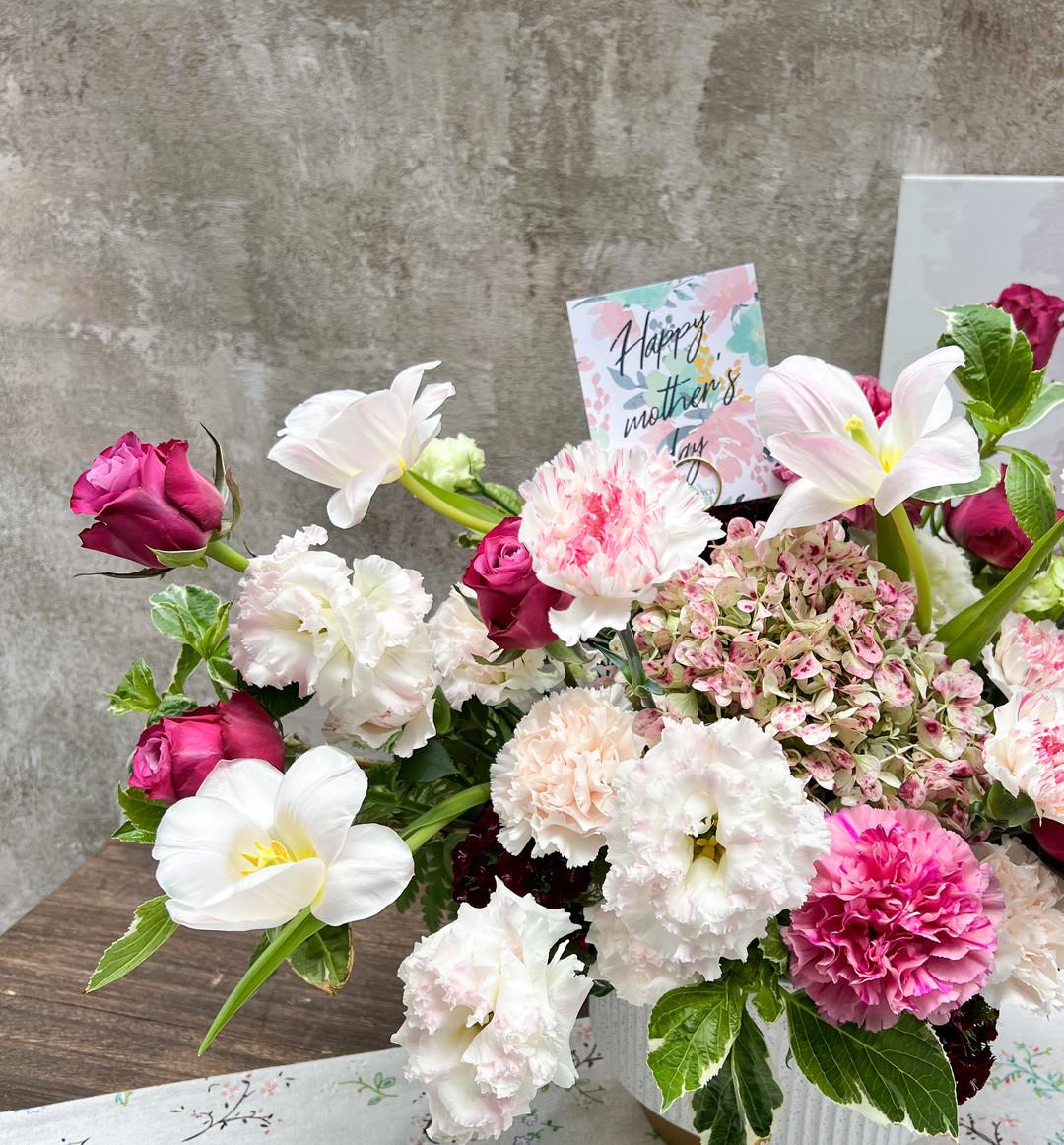 花材:康乃馨、繡球花、鬱金香、桔梗、玫瑰