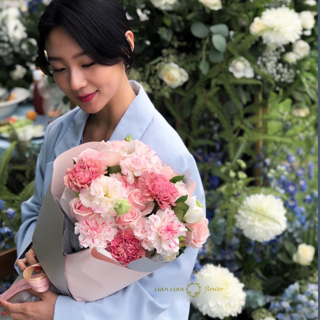 溫潤感十足的粉色康乃馨與玫瑰相互交織,