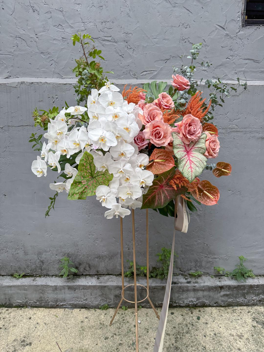 花材:進口流沙玫瑰、蝴蝶蘭、彩葉芋、龜背芋、火鶴、尤加利葉