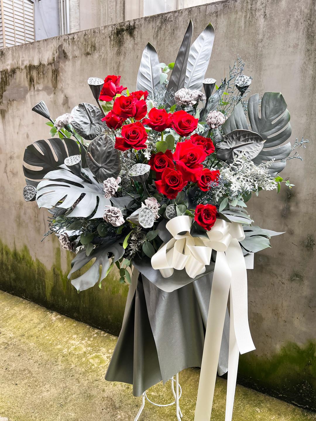 花材:進口紅玫瑰、康乃馨、蓮蓬、龜背芋、尤佳利葉