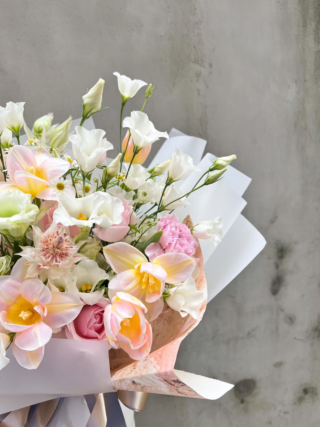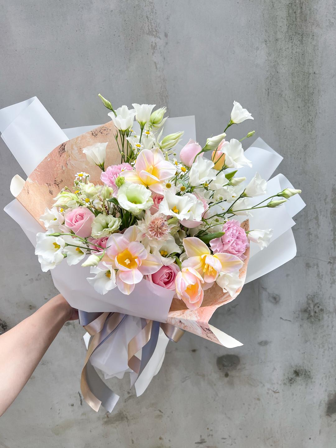 花材:涼風桔梗、鬱金香、康乃馨、 新娘花、翠粉玫瑰