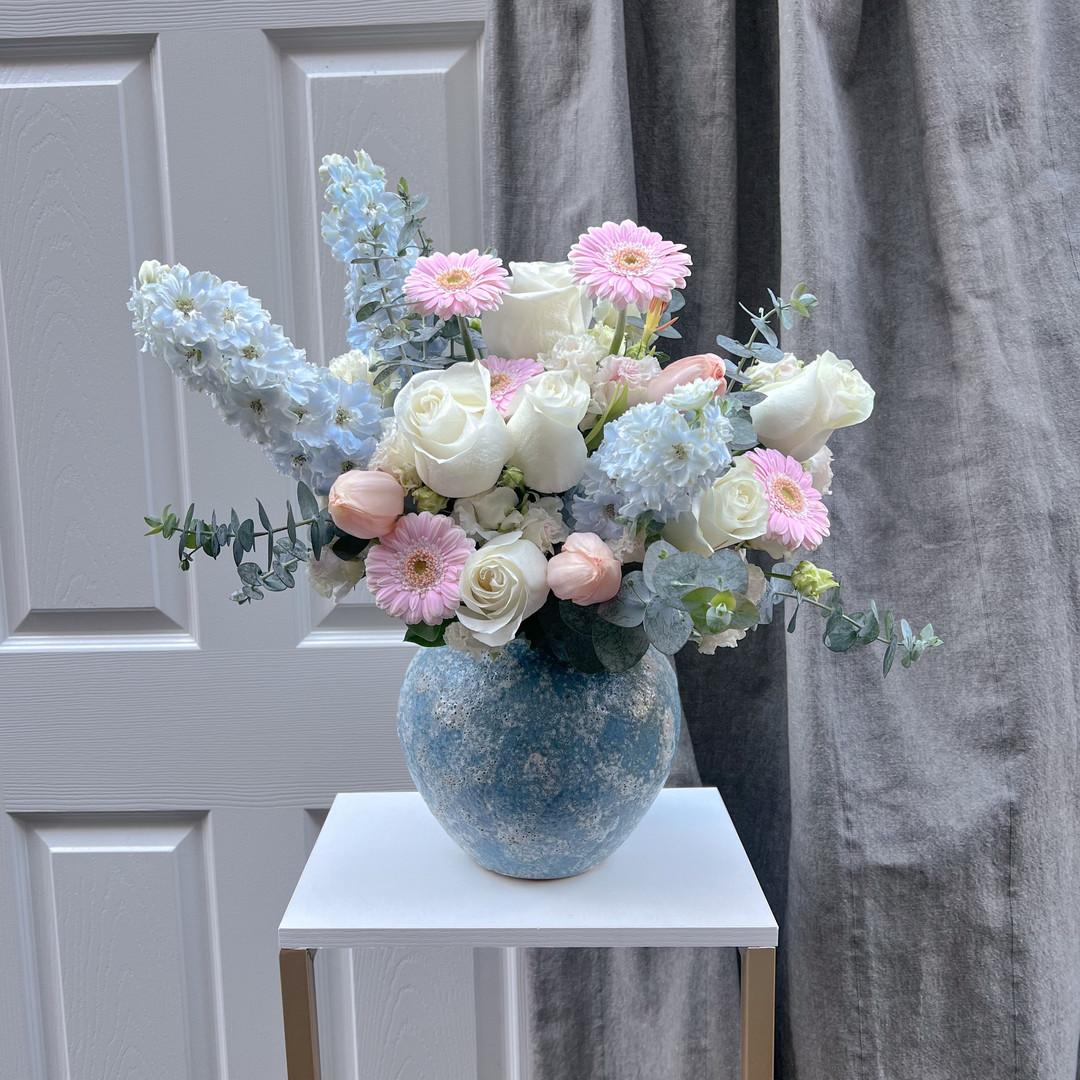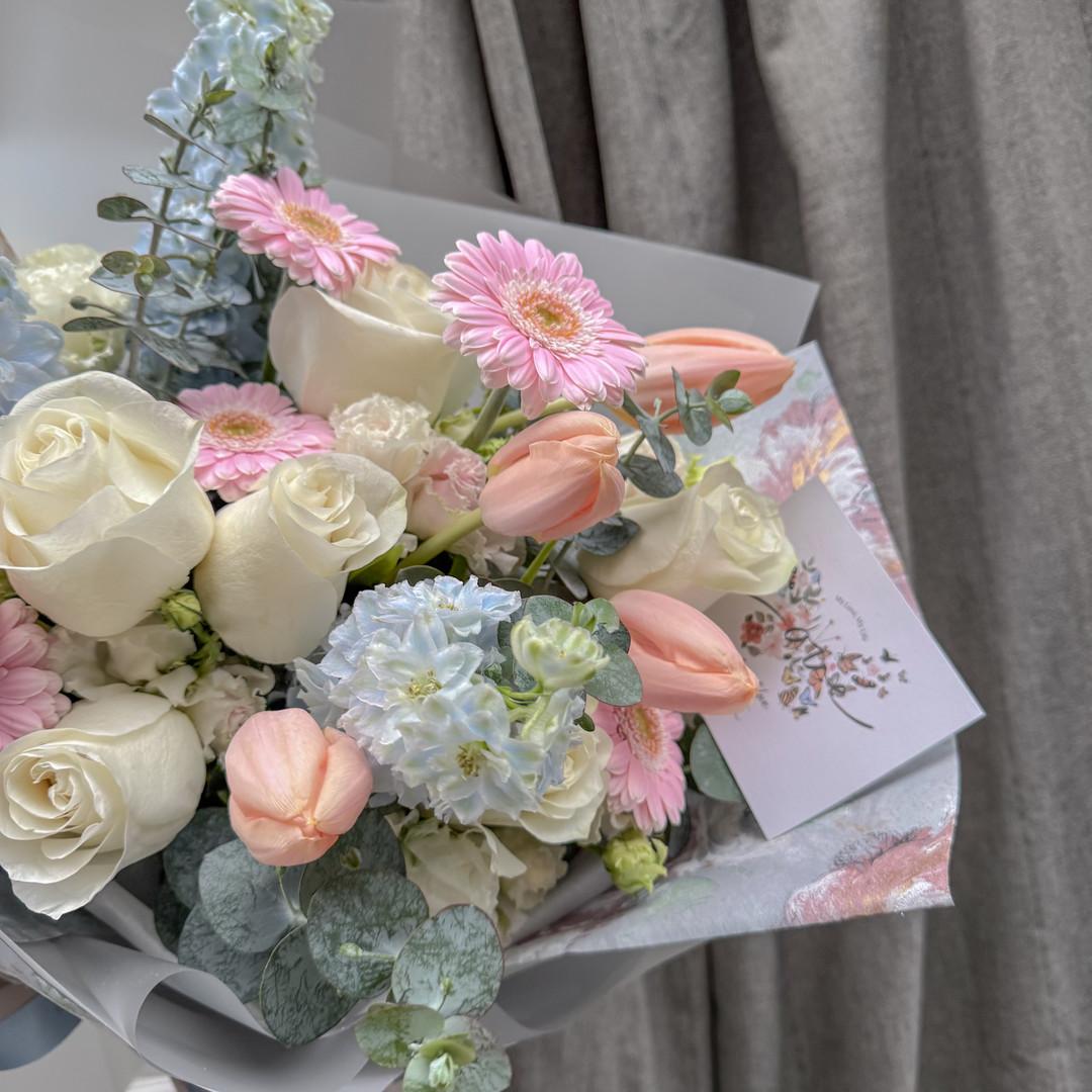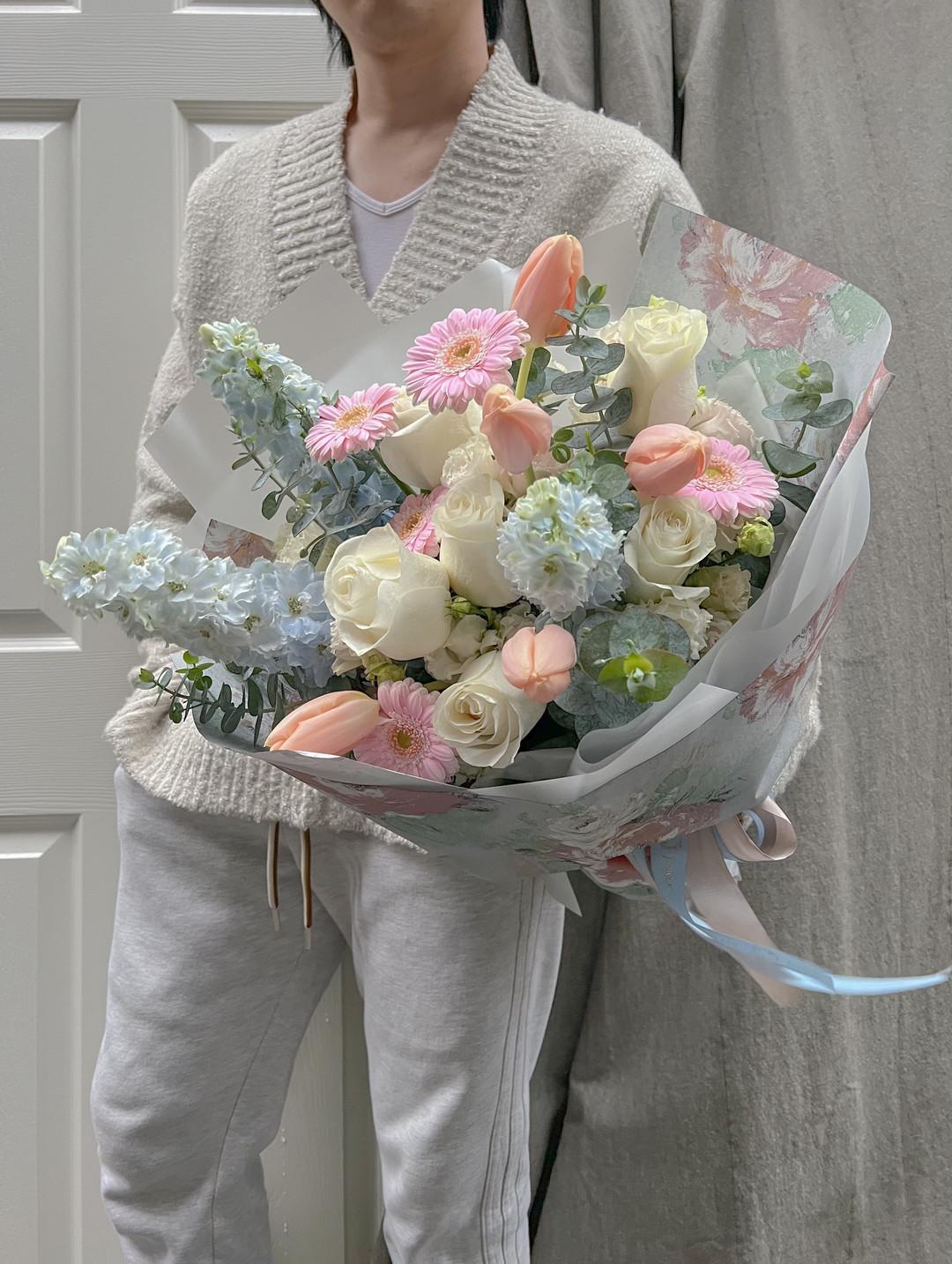 花材:藍色大飛燕草、進口白玫瑰、鬱金香、粉太陽花、白桔梗、尤加利葉