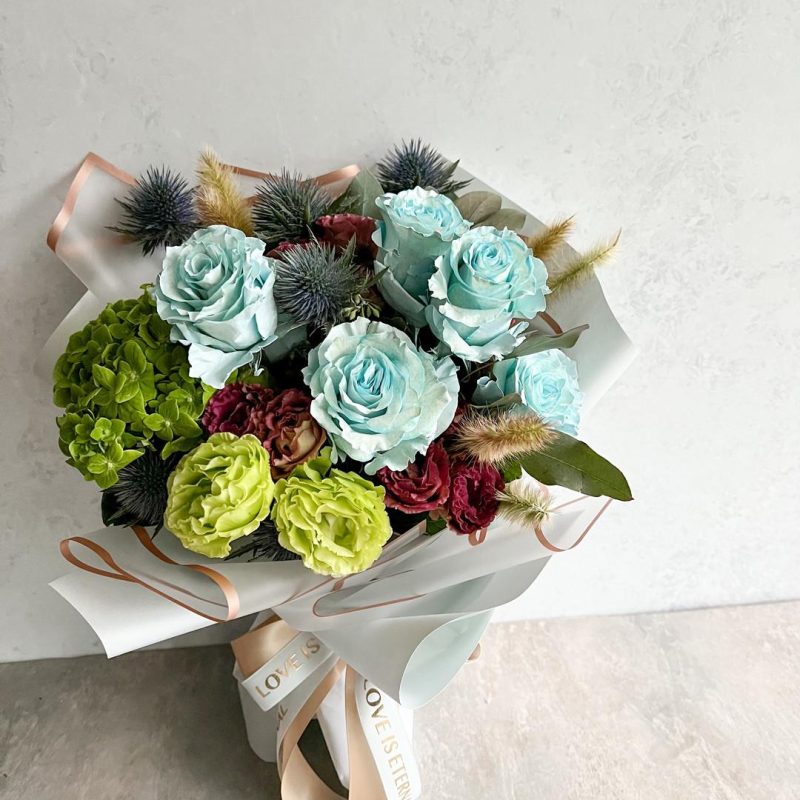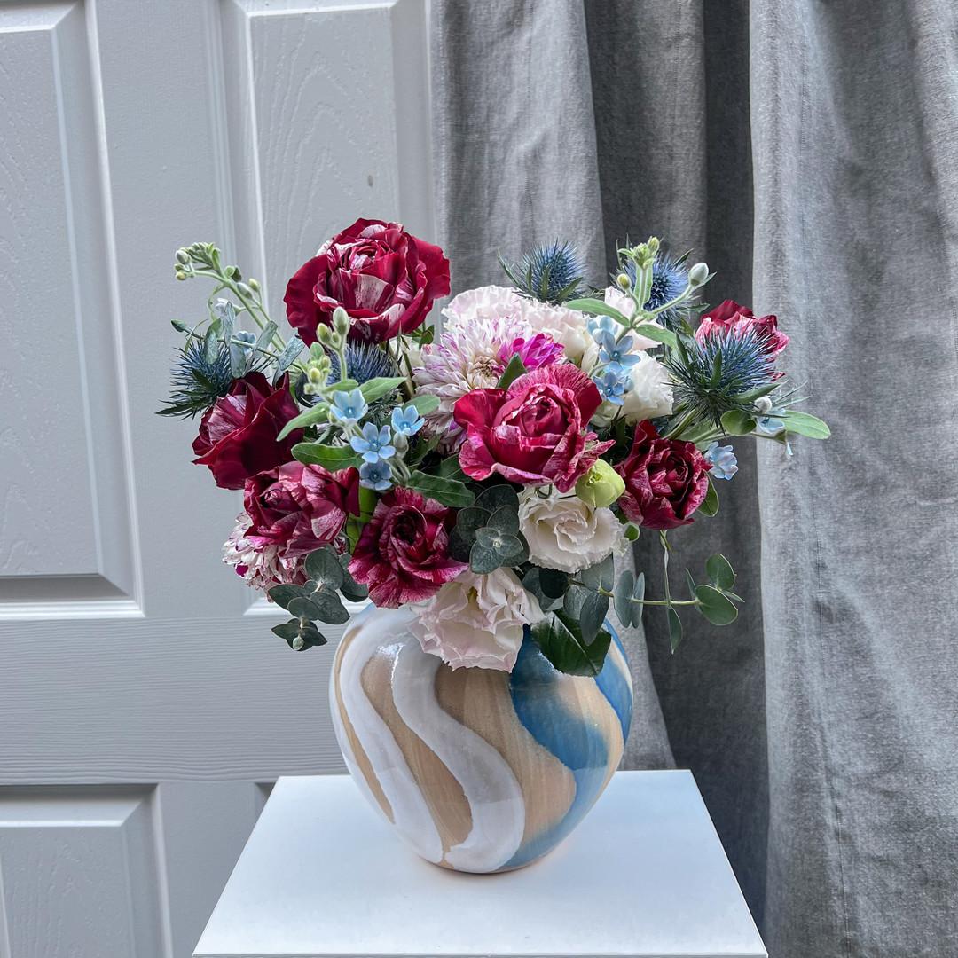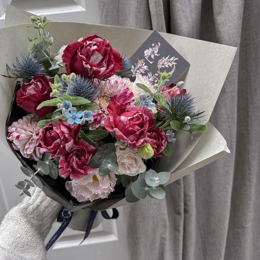 花材:玫瑰、桔梗、大理花、藍星花、藍薊花、尤加利葉