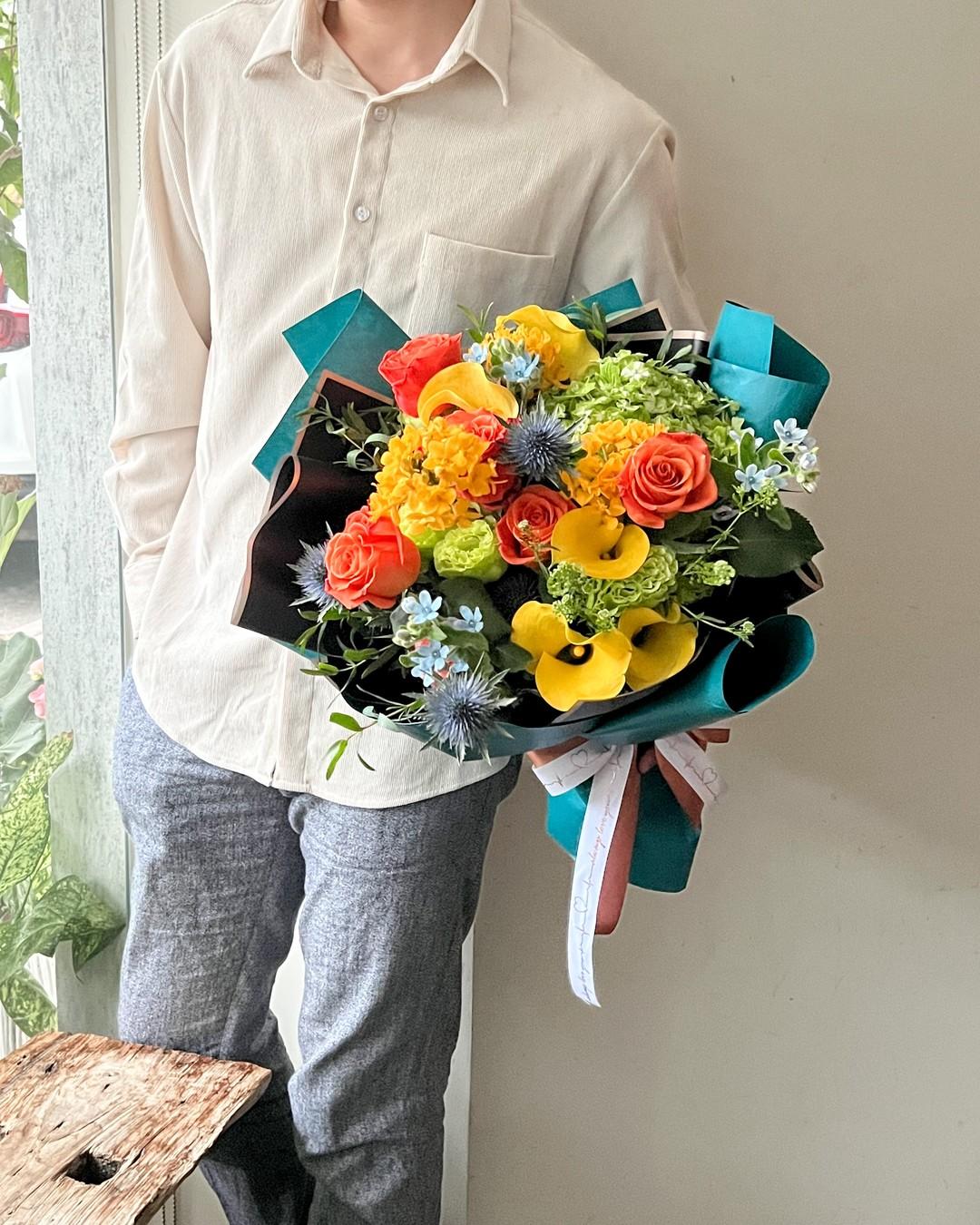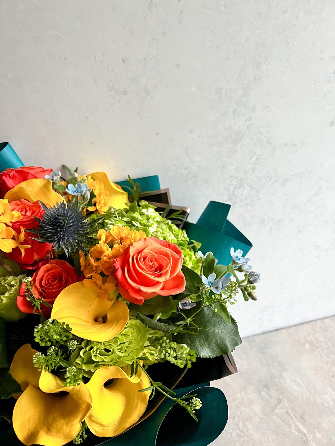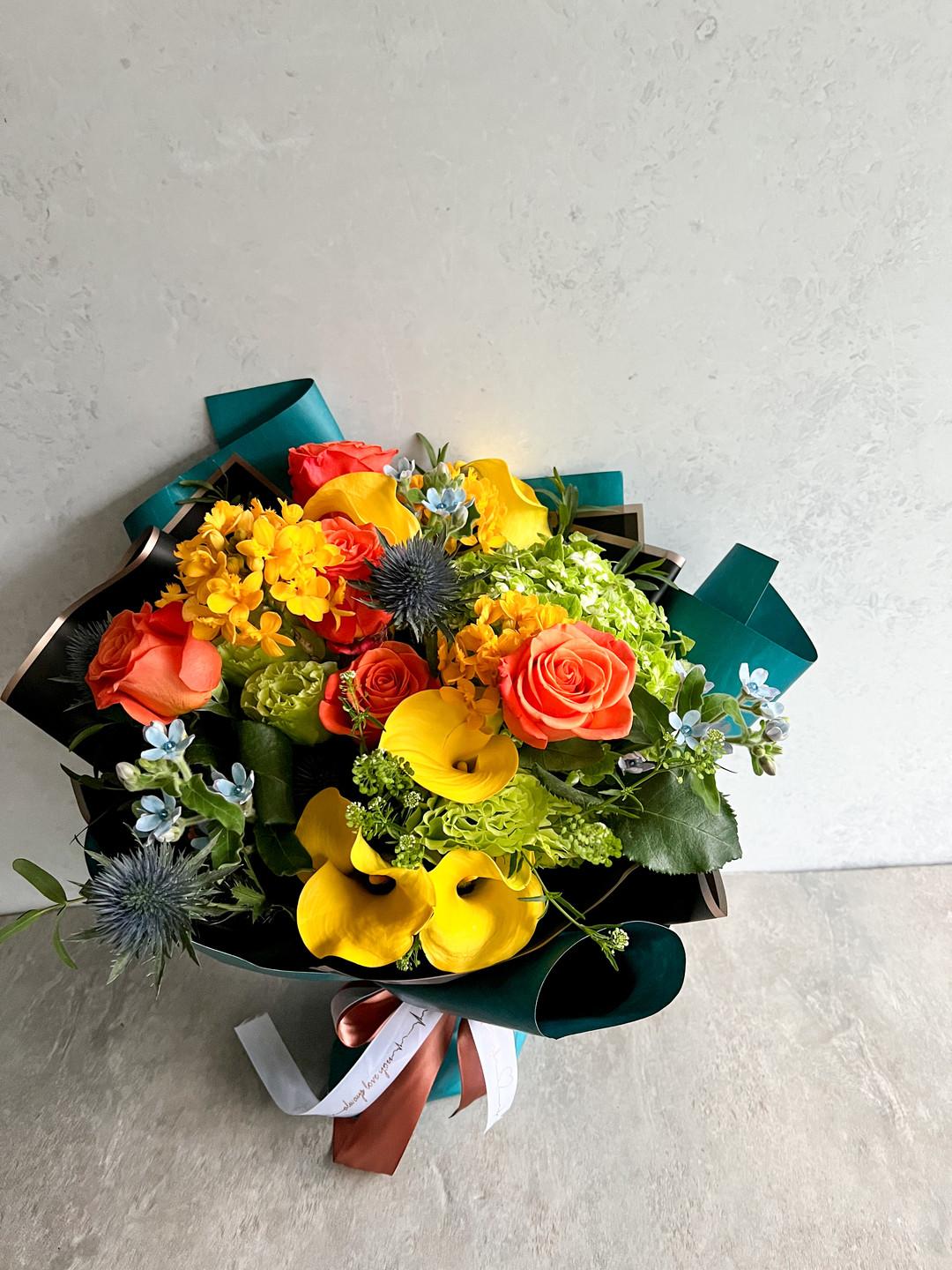 花材:進口橘玫瑰、黃海芋、藍星花、綠繡球、綠桔梗、藍薊花、黃樹蘭