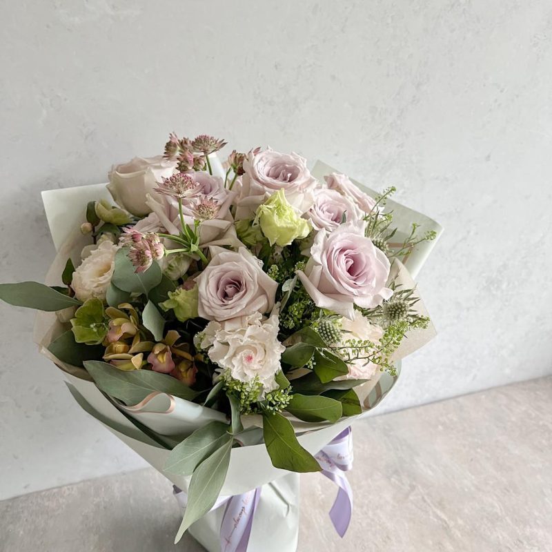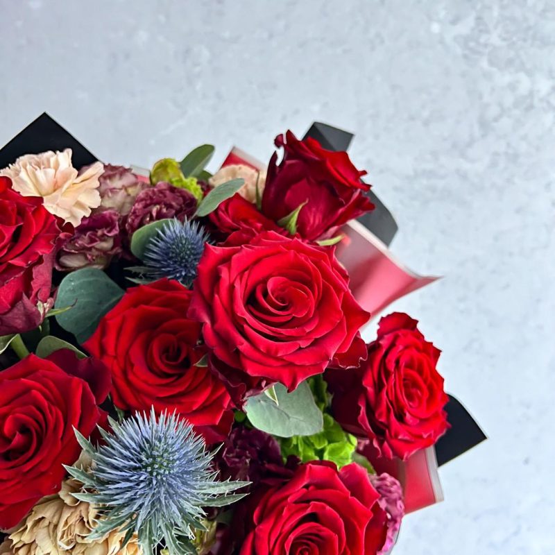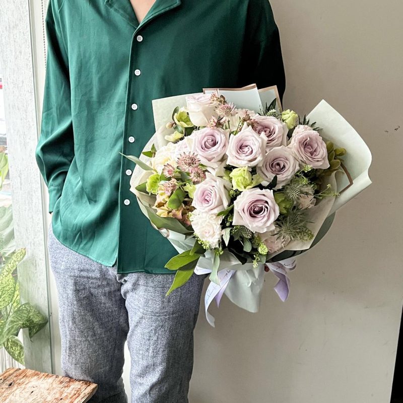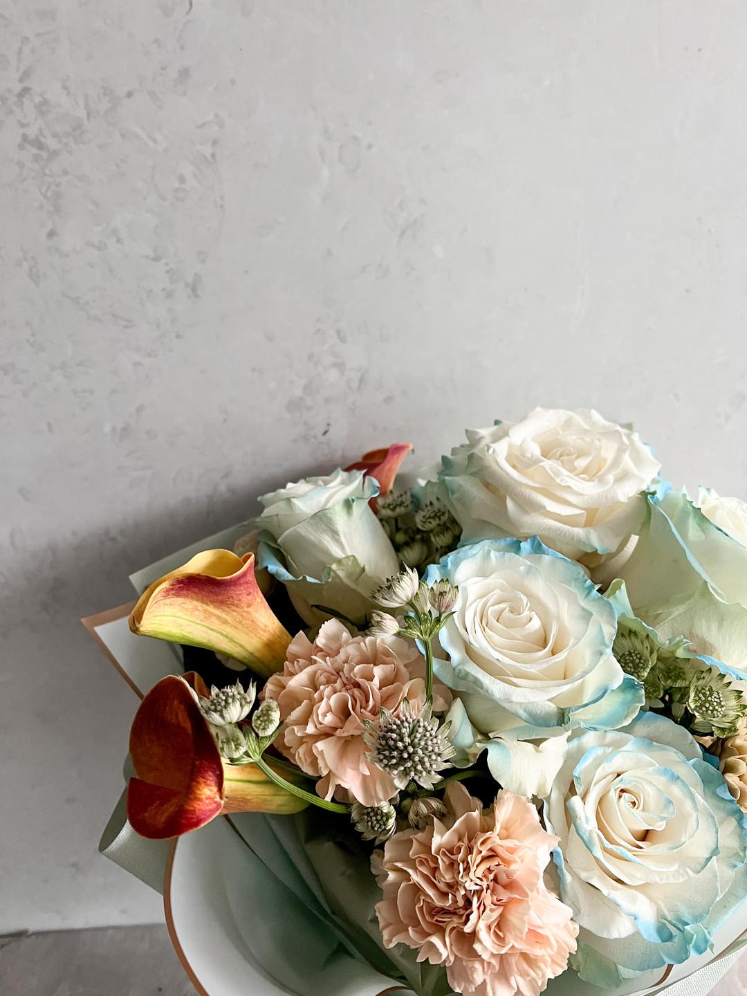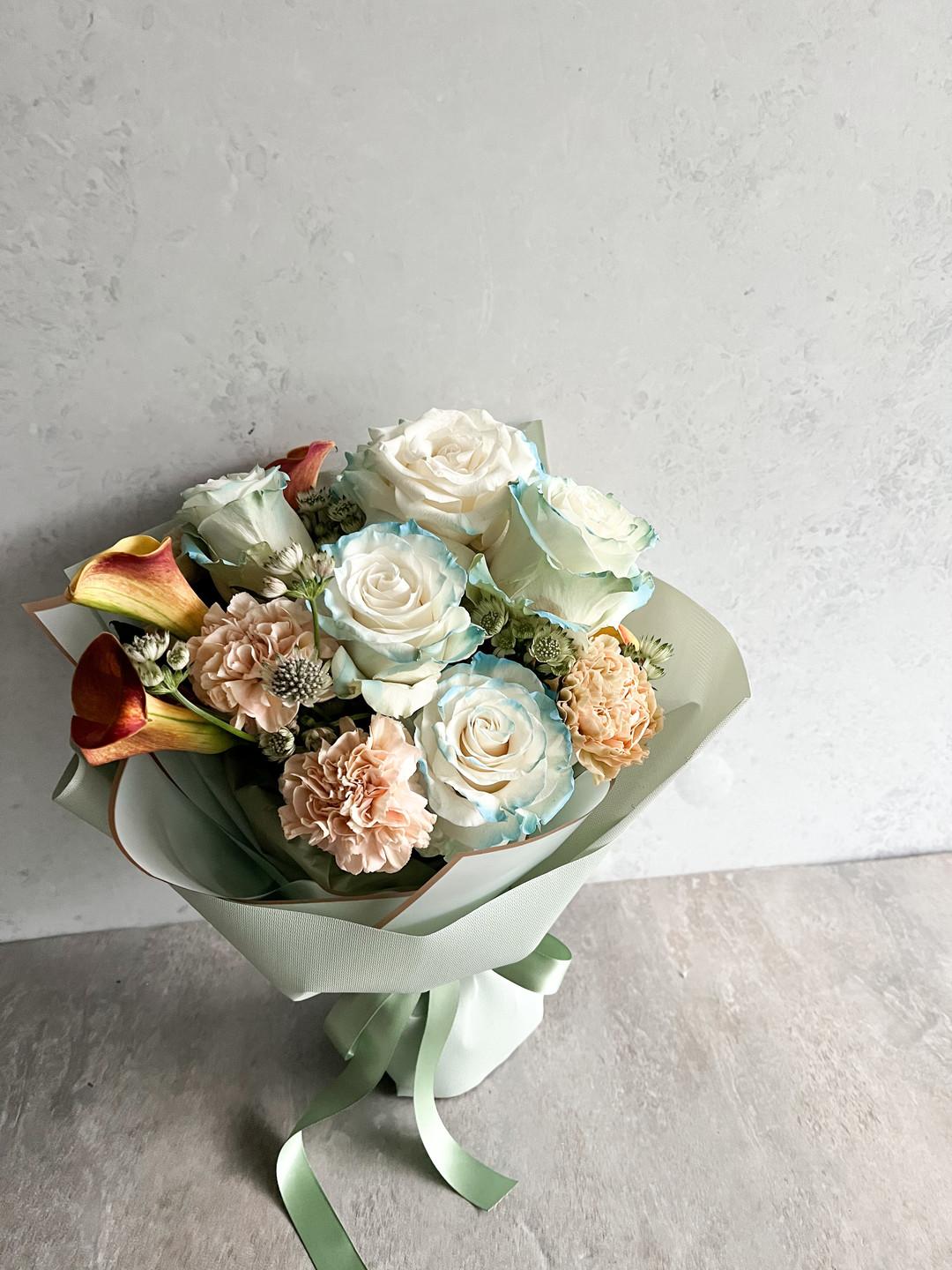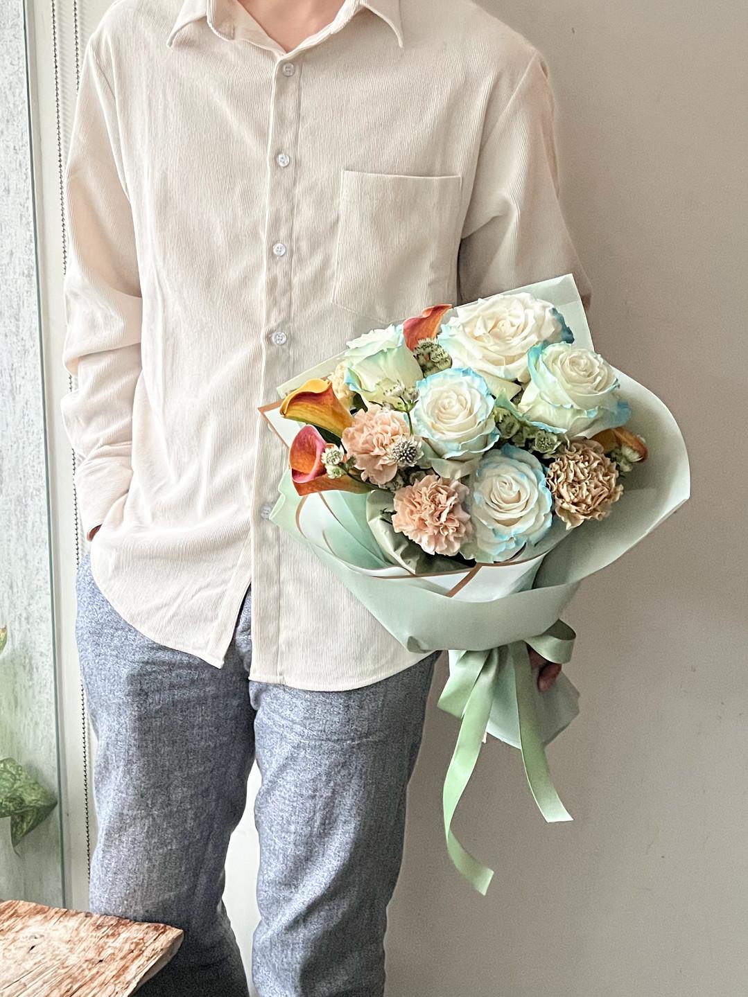 花材:進口染藍邊玫瑰、康乃馨、白芨、海芋